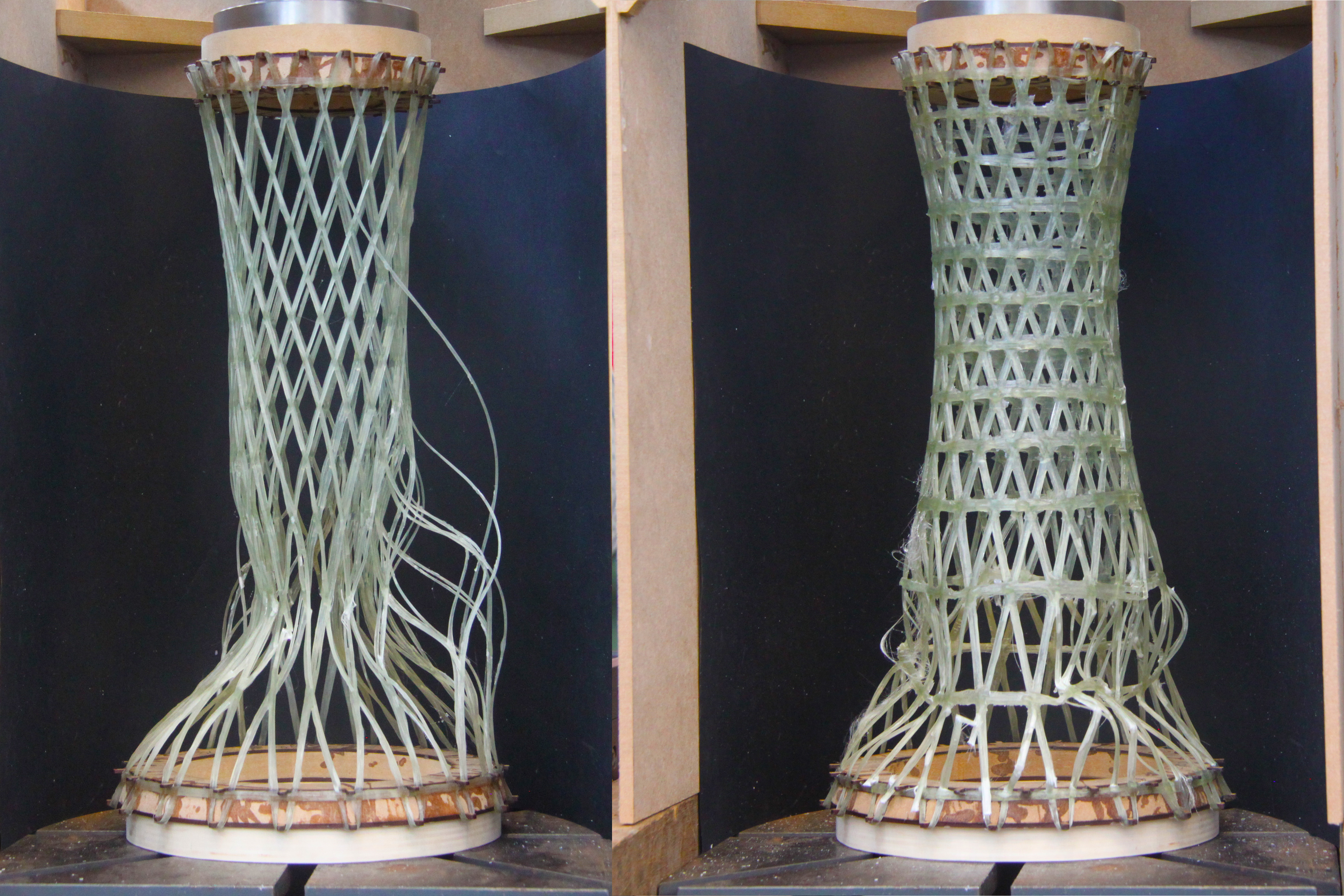 Because of these uncertainties in behaviour two design proposals were made. The first proposal (type A) only had the bundle crossing between the two moulds. The second (type B) had interwoven circular reinforcements at each level of intersections forming an iso-grid. Due to the tension on the fibres when wound the polar bundles of both types are straight. Physical tests were needed to come to a decisive conclusion on the structural behaviour.
