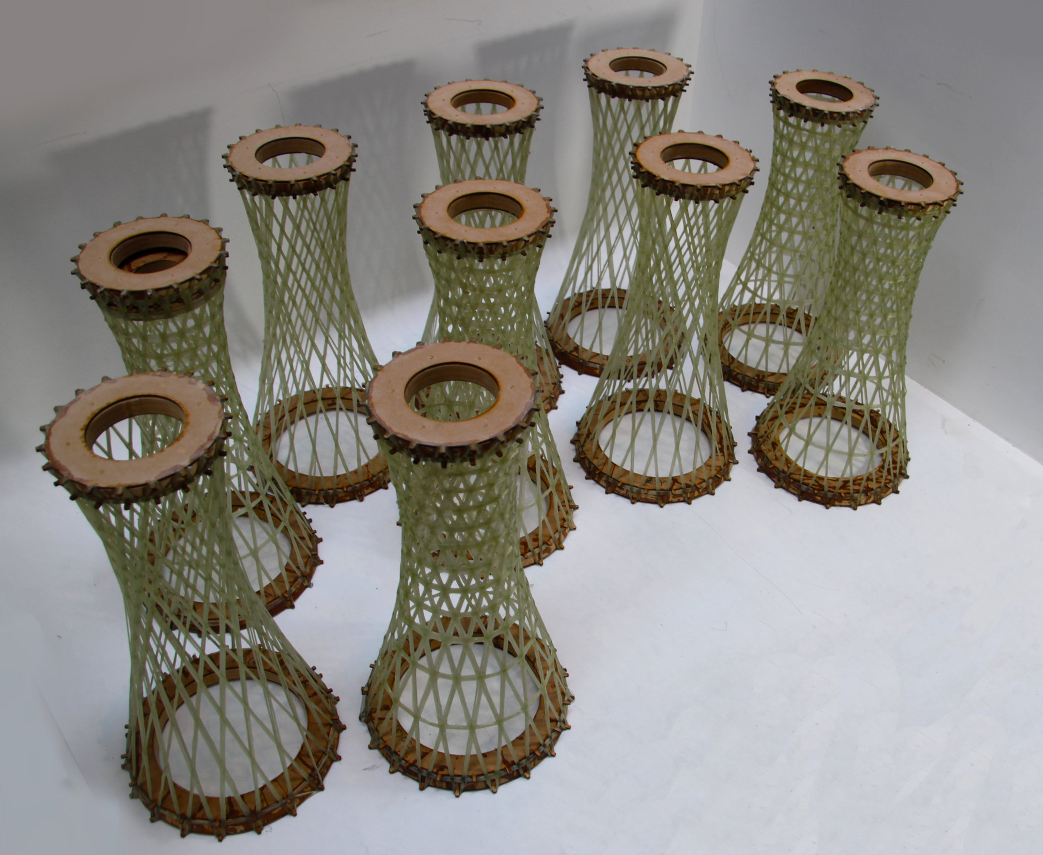 The structural behaviour of the pillar raised some questions, which could not be answered conclusively by various tutors. The first was the behaviour of the hyperbolic shaped grid when loaded in compression: Would it act as a statically indeterminate net of beams or as a hyperbolic surface comparable with a concrete cooling tower? The second was the behaviour of a composite beam in compression, what would be the influence of the fibres? The final question was to what extend the intersections were strong enough to increase the overall strength of the pillar.